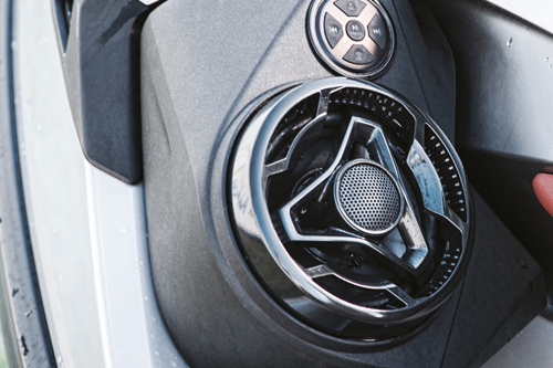 Das wasserdichte BRP Premium Audiosystem möchte man bei längeren Aufenthalten auf dem Wasser nicht mehr verzichten. Die Bedienung oder Steuerung erfolgt entweder über das Mobiltelefon oder über ein wasserdichtes Bedienelement auf der linken Seite.
