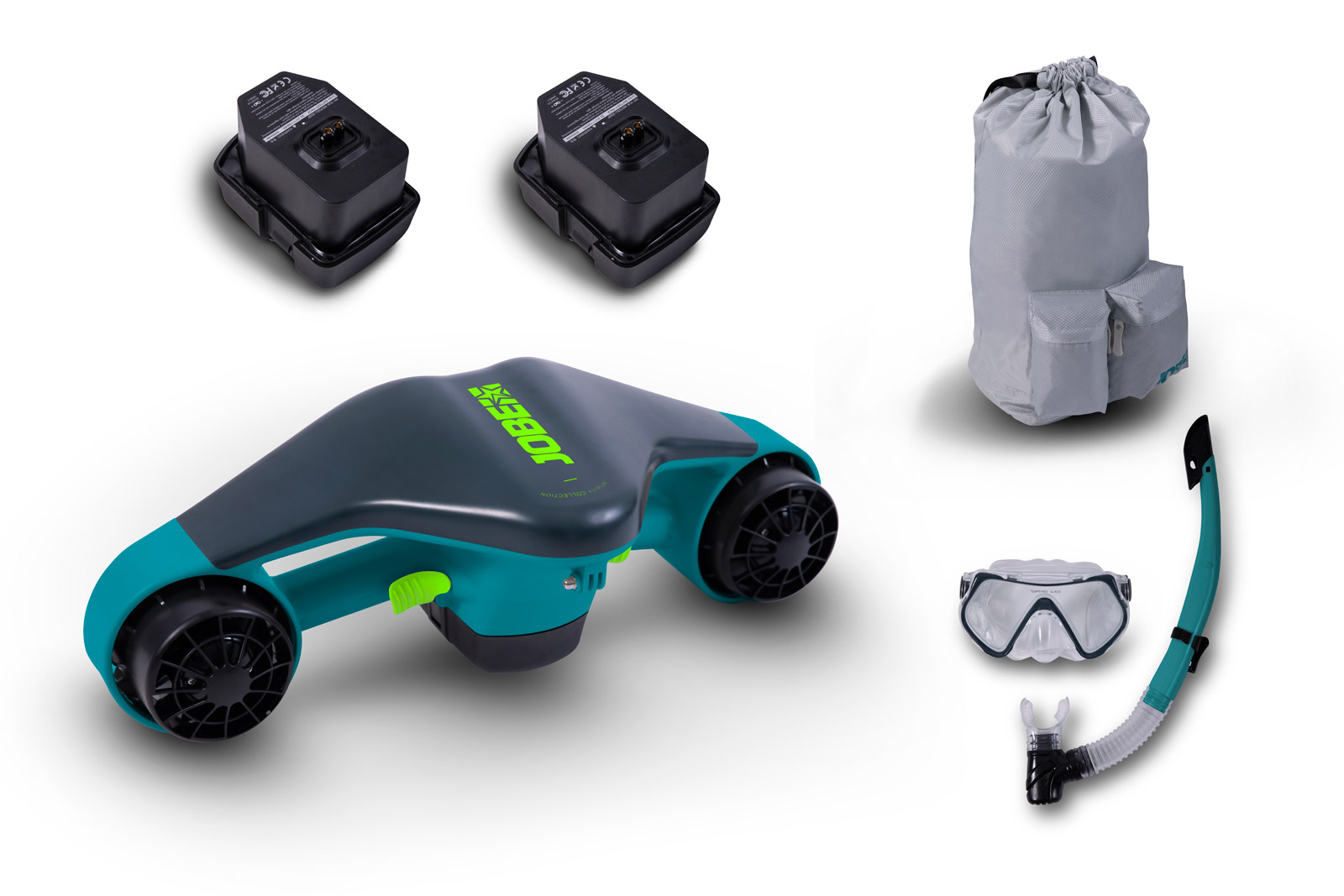 Mit dem Jobe Infinity Seascooter Package wird das Tauchen und Schnorcheln zu einem aufregenden Erlebnis! Der selbstschwimmende, elektrisch angetriebene Seascooter ermöglicht Erkundungen bis zu einer Tiefe von 30 Metern und bietet dank drei Geschwindigkeitsstufen ein individuell anpassbares Taucherlebnis. Das Paket umfasst eine praktische gepolsterte Tasche und ein Schnorchelset, um Ihre Ausflüge perfekt abzurunden. Anpassbares Taucherlebnis mit moderner Ausstattung Der Seascooter verfügt über eine maximale Geschwindigkeit von 5 km/h und eine Schubkraft von 9 kg, ideal für ruhiges Gleiten oder schnelleres Fortbewegen. Zwei Li-Ion-Akkus (25,2V / 5Ah) bieten eine Gesamtbetriebsdauer von bis zu 2 x 37,5 Minuten. Mit einer Ladezeit von nur vier Stunden pro Akku ist er schnell wieder einsatzbereit. Der integrierte GoPro-Mount erlaubt es Ihnen, Ihre Unterwasserabenteuer mühelos zu dokumentieren. Mit einem Gewicht von nur 3,5 kg ist der Scooter leicht zu transportieren, und die gepolsterte Tasche schützt ihn zuverlässig. Beachten Sie, dass die Batterien flugsicher verpackt werden müssen. Technische Daten und Lieferumfang Geschwindigkeiten: 3 Stufen, max. 5 km/h (3,1 Mp/h, 2,7 Knoten) Tauchtiefe: Bis zu 30 m (98 ft.) Laufzeit: Bis zu 2 x 37,5 Minuten mit zwei Li-Ion-Batterien (25,2V / 5Ah) Ladezeit: 4 Stunden pro Akku Schubkraft: Max. 9 kg Design: Selbstschwimmend, GoPro-Halterung integriert Abmessungen: 58 x 24 x 13 cm (23"" x 9"" x 8"") Gewicht: 3,5 kg (7,7 lbs) Temperaturbereich: -10°C bis 45°C (14°F bis 113°F) Lieferumfang: Seascooter, gepolsterte Tasche, Schnorchelset Wartungshinweis: Mit Süßwasser reinigen und Batterien separat verpacken für Flugreisen Hinweis: Nicht kompatibel mit Batterien des Modells 2023