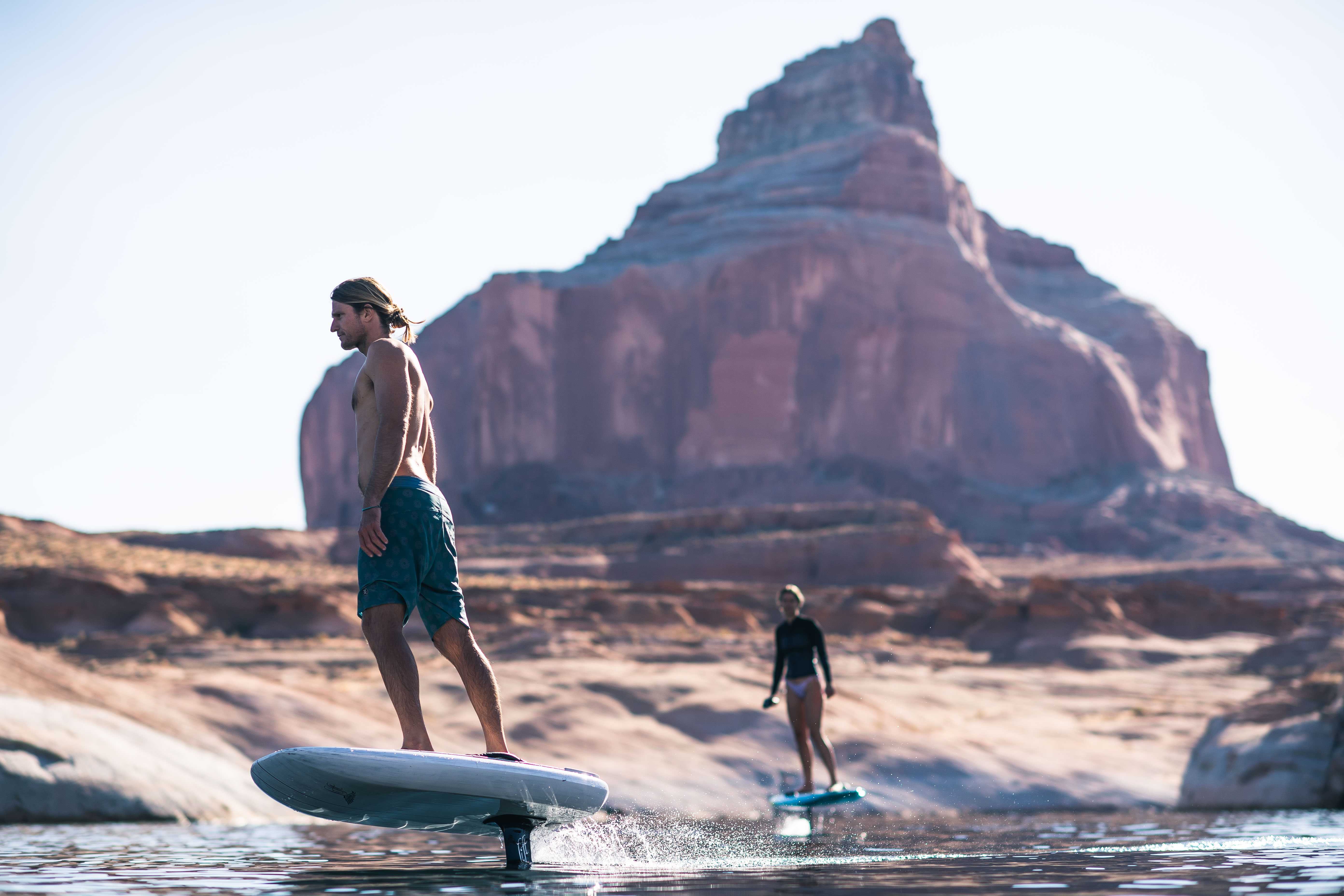 Die eFoil-Boards kommen mit einer Fernbedienung, die Sie mit Ihrem Board verbinden können, um während der Fahrt ganz einfach Ihre Geschwindigkeit von "Gonna Fly", dem Modus für Anfänger, bis hin zu "Rocket Ride", der idealen Geschwindigkeit für fortgeschrittene Fahrer, anpassen können. Die Fernbedienung bietet ein hochauflösendes, vollfarbiges Display, das auch bei direkter Sonneneinstrahlung gut ablesbar ist, außerdem haben Sie mit der eFoil-App Ihren persönlichen Begleiter dabei, der Ihnen hilft, nicht nur Ihre Ausrüstung zu überwachen, sondern auch Fahrten zu tracken und neue Techniken zu erlernen.